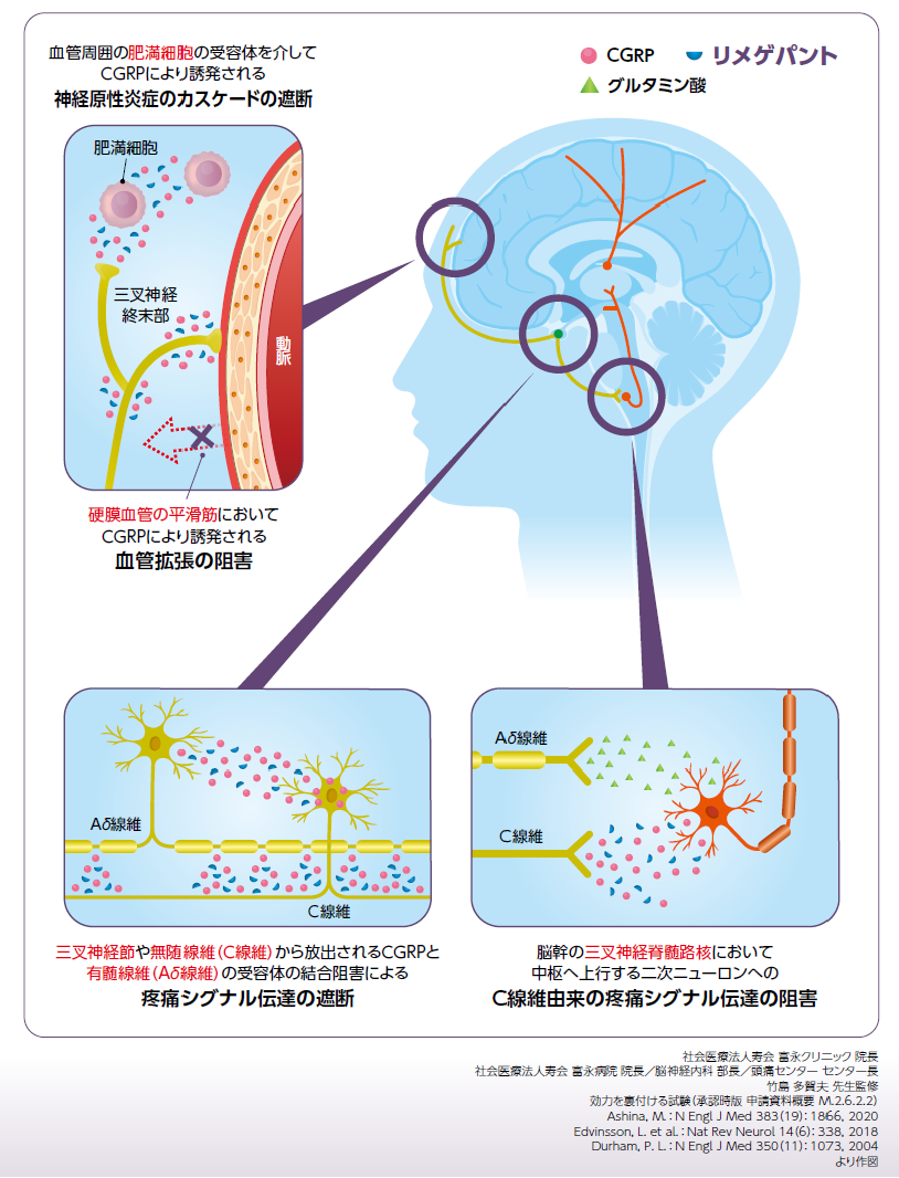 CGRPは人の体内に広く分布する神経ペプチドで、大きくalpha-CGRP とbeta-CGRPに分類され、両者の体内 における分布は重複もありますが、alpha-CGRPが中枢ならびに末梢神経系に主に分布します。なんらかの原因(一説では視床下部の活性化が想定されています)で最終的に頭蓋内の硬膜血管周囲 に分布する三叉神経系に刺激が伝わると、三叉神経を構成する無髄線維(C線維)からCGRPが放出 され、これが同じく三叉神経の有髄線維(Aδ線維)に分布するCGRP受容体と結合することで、より 早いシグナルとして順行性に痛みが伝わり、三叉神経脊髄路核で二次ニューロンに乗り換えた後に 視床を経てより高次の中枢へ投射することで痛みが知覚されます。一方、頭蓋内の三叉神経終末部 ではCGRPによる硬膜血管の拡張や肥満細胞の脱顆粒による炎症(神経原性炎症)の誘導が三叉神経 における末梢性感作を誘導します。同時に逆行性伝導を介してさらなる三叉神経の活性化はより広範 な血管拡張と炎症を誘導し、これらはすでに感作された三叉神経系を痛みのシグナルとして順行性に 伝達します。